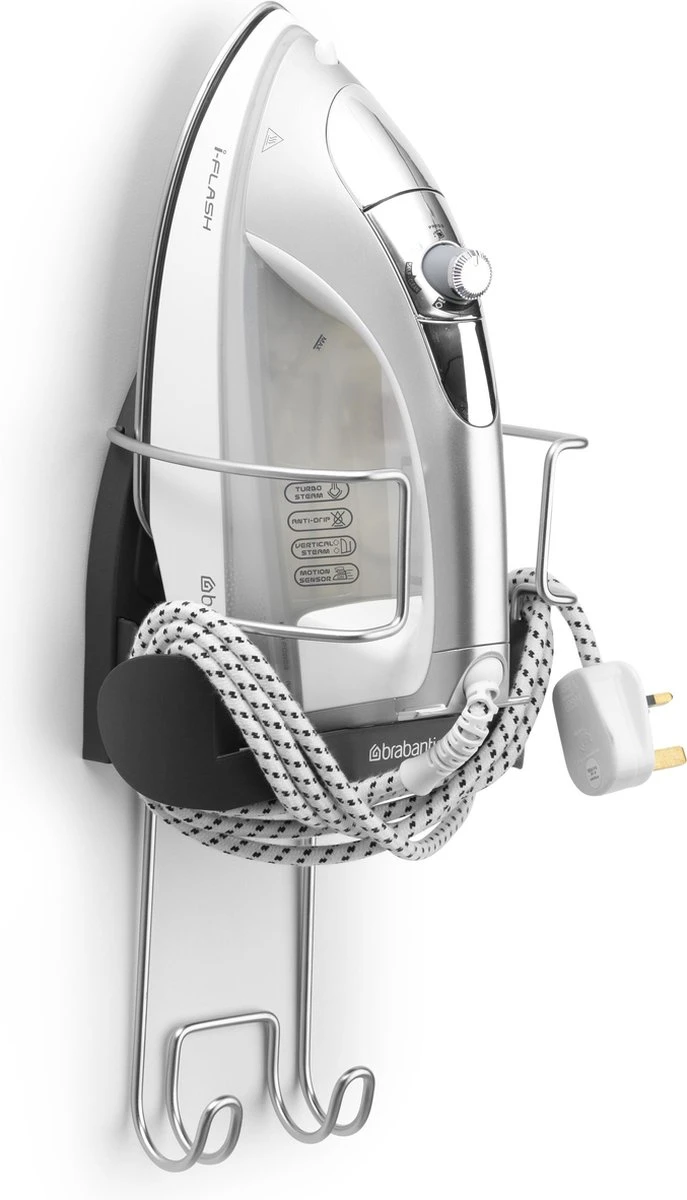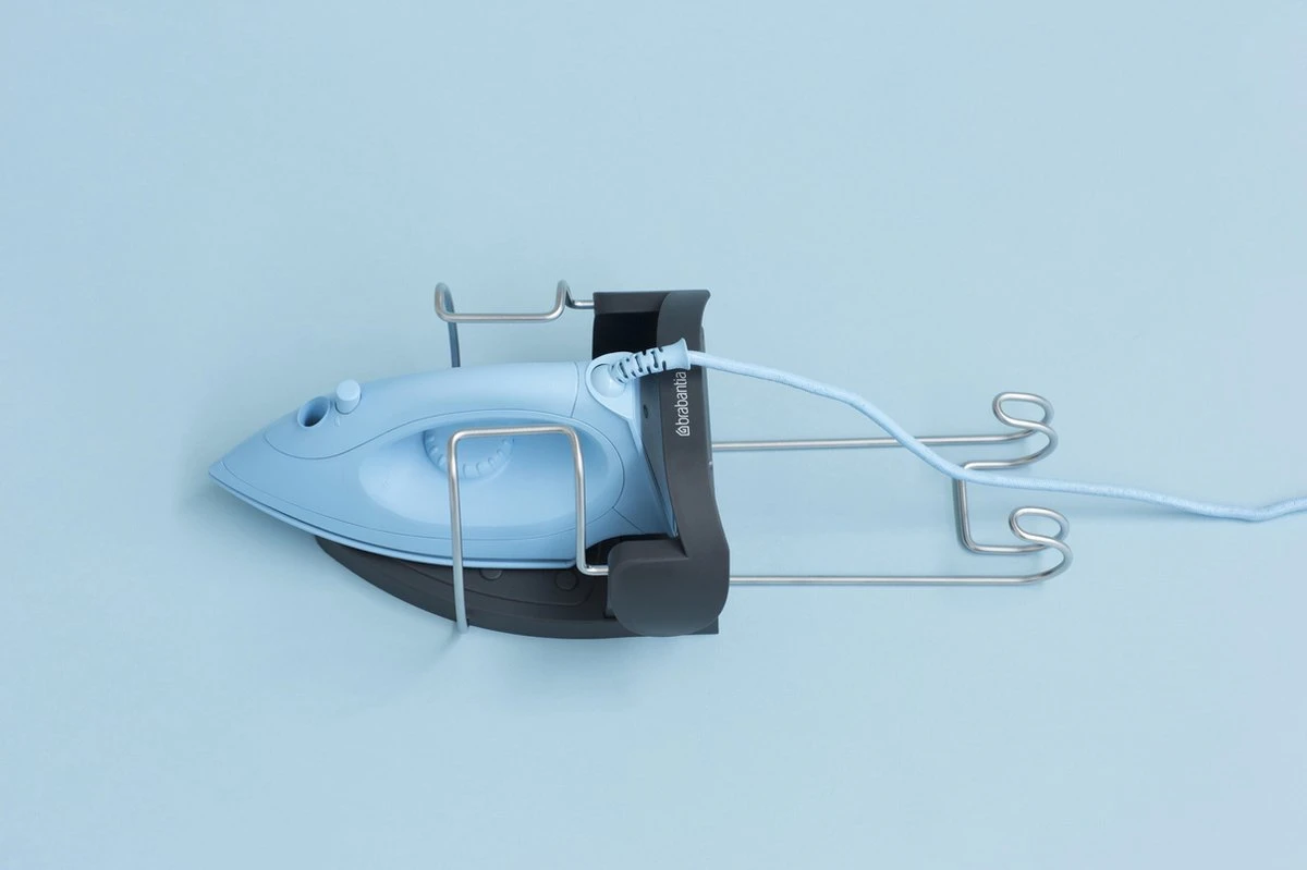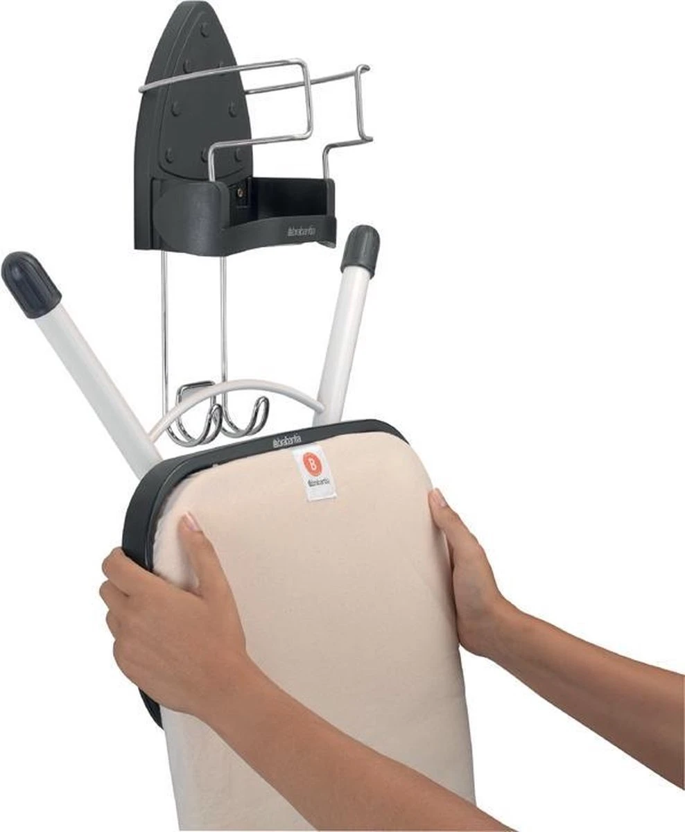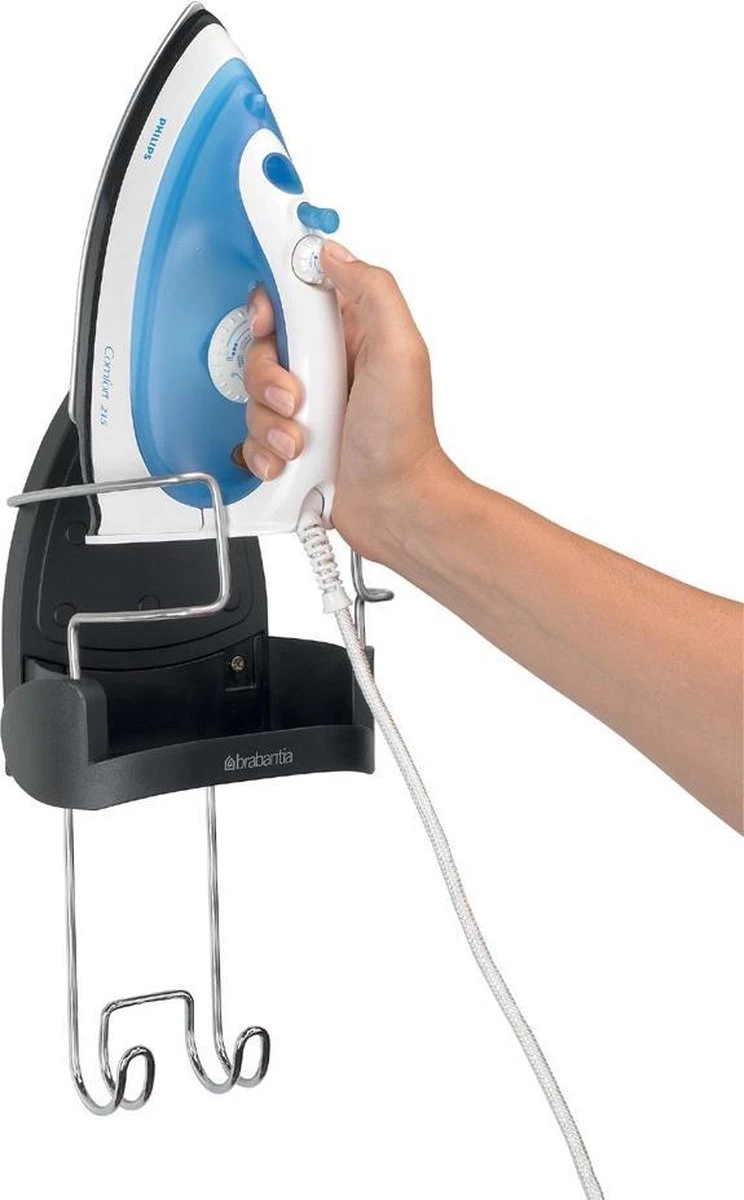 Klaar met strijken? Laat je strijkijzer niet afkoelen op je strijkplank, maar berg alles snel en veilig op met de strijksethouder van Brabantia. Gemaakt van hittebestendige materialen, dus eerst afkoelen hoeft niet. Zet je hete strijkijzer vast, rol het snoer op en hang de strijkplank aan de stevige haak. Veilig voor kleine handjes, netjes en opgeruimd in een mum van tijd.