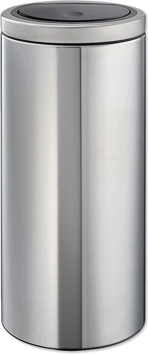 Een stijlvolle Brabantia Touch Bin afvalbak met een platte bovenkant. De afvalverzamelaar is gemakkelijk te openen en te sluiten dankzij het eenvoudige druksysteem.